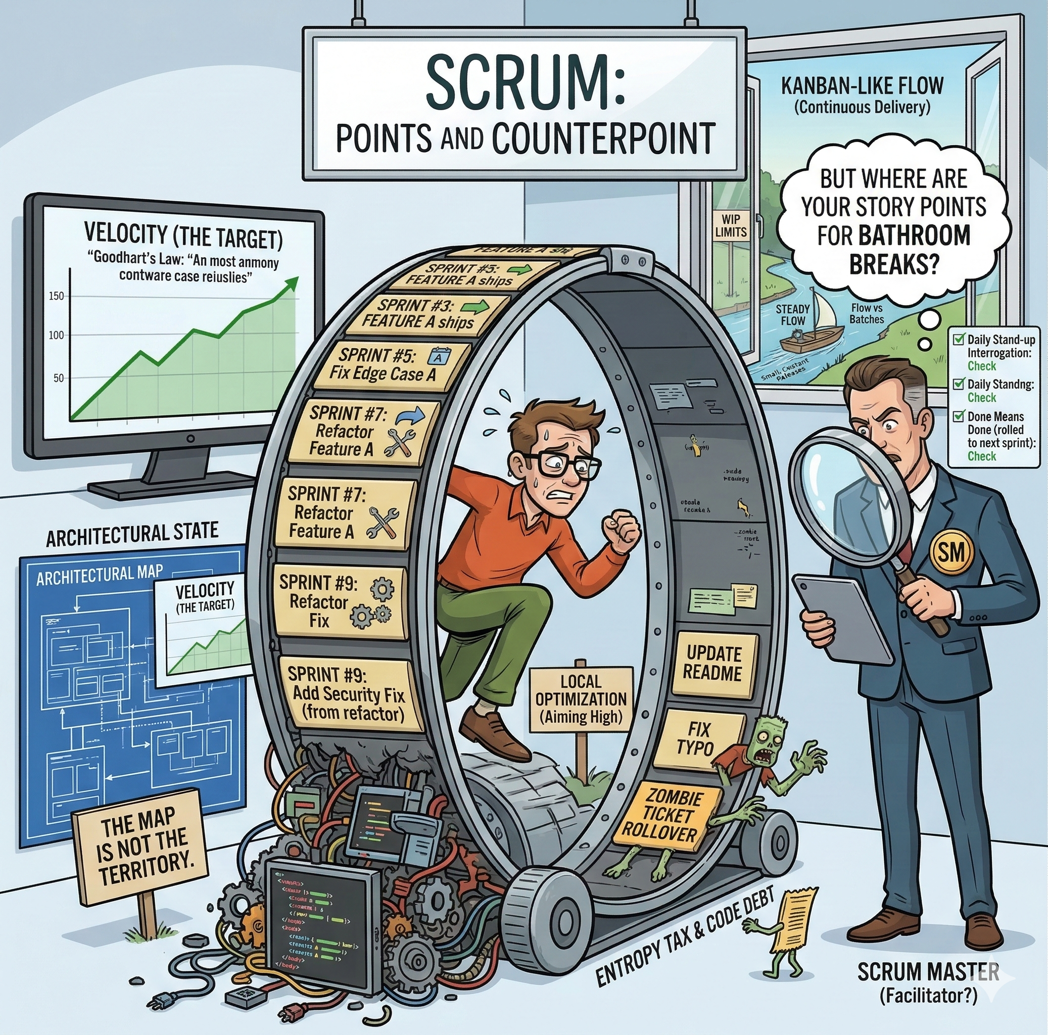 This essay explores several common failure modesânot because Scrum is uniquely flawed, but because its incentives frequently reward the wrong behaviors.